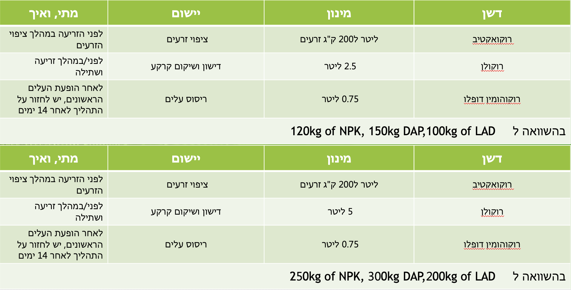 • 2.5–5 ליטר ל10 דונם לריסוס,